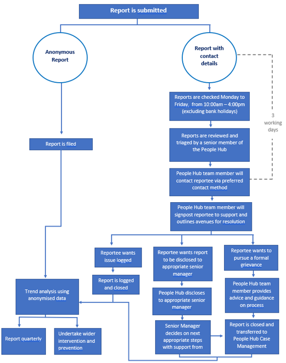 Reports with contact details are checked Monday – Friday from 10:00am – 4:00pm (excluding bank holidays. Once you have submitted your report, it will be reviewed by a member of the People Hub. They will contact you using your chosen contact method within 3 working days of you submitting your report.